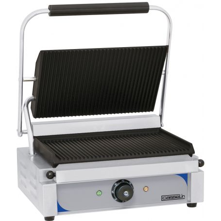 - Robustes Edelstahlgehäuse- Massive Gusseisenplatten für optimale Wärmeverteilung- Oben Gerillt unten gerillt- Temperatur stufenlos regelbar von 50°C bis 300°C- Kontrollleuchte- Heizphasen Kontrollleuchte- Fettabscheider mit Hitzeschutzgriffen- Obere Platte : L 335 x T 220 mm- Untere Platte : L 335 x T 230 mm- Leistung : 2,2 kW / 230 V- Abmessungen : L 410 x T 370 x H 200 mm- Gewicht : 19 Kg> Reinigungsbürste im Lieferumfang enthalten