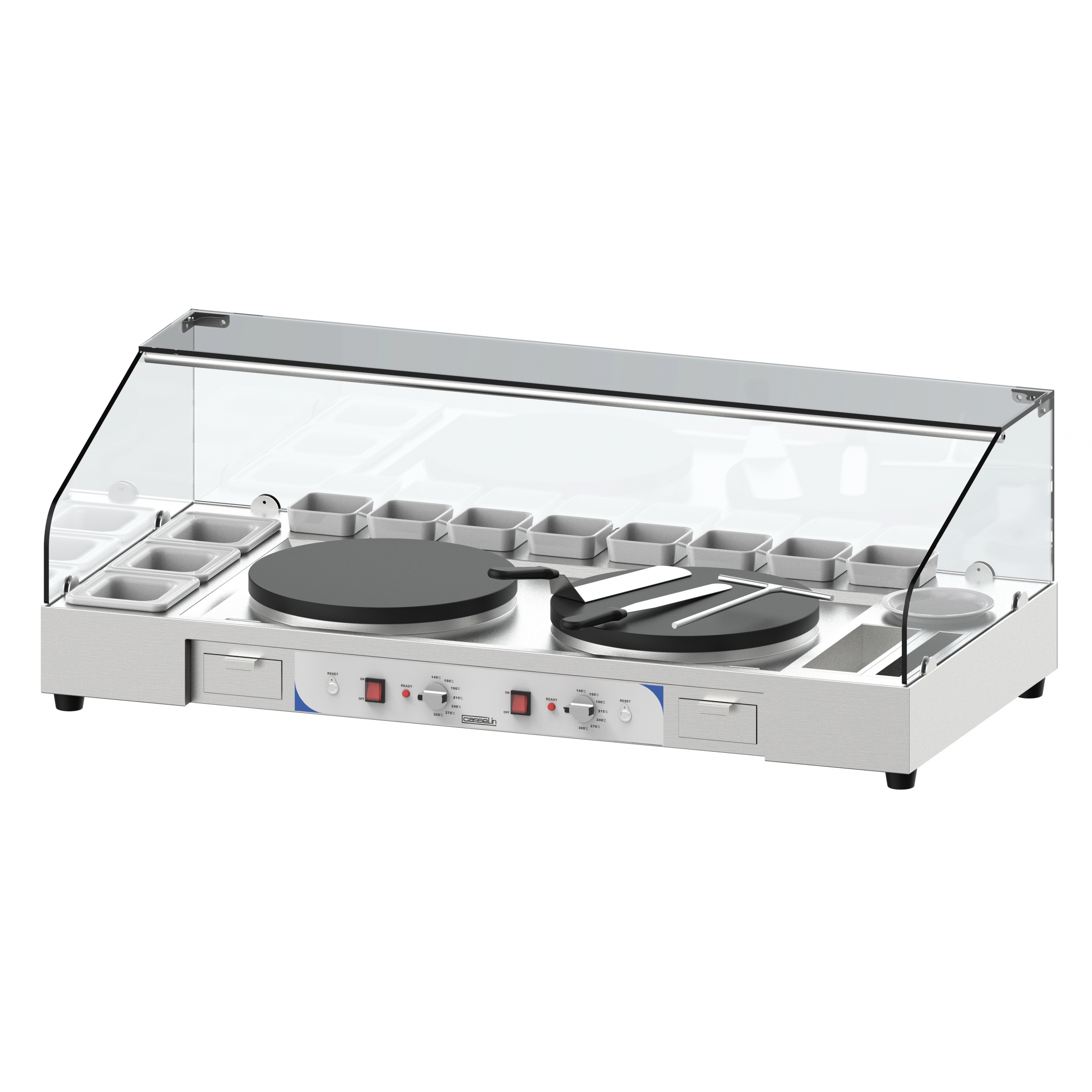 - 2 eingelassene und unabhängig voneinander arbeitende elektrische Crêpe-Geräte Ø400 mm